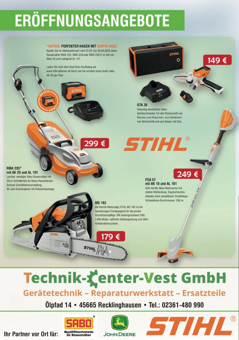 Als Ihr Fachhändler für hochwertige Garten- und Forsttechnik bieten wir Ihnen eine umfassende Auswahl an Produkten renommierter Hersteller. In unserem 250 m² großen Verkaufsraum können Sie sich persönlich von der Qualität der Stihl-Produkte überzeugen. Darüber hinaus führen wir leistungsstarke Rasenmäher von Sabo und John Deere.